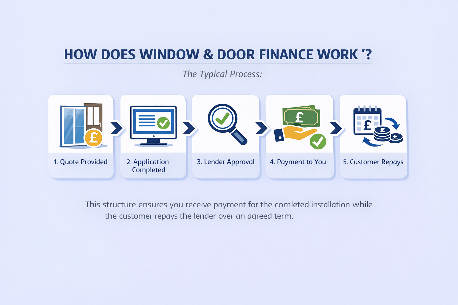 Most glazing businesses do not lend money directly. Instead, they introduce customers to a regulated lender who manages the credit agreement and repayments.